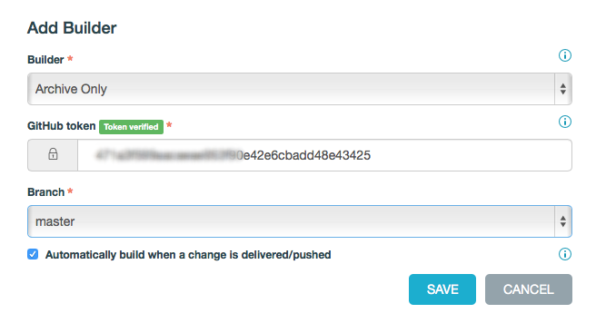 Now back to your deployment configuration, click on the Plus sign in “add a builder” and enter the config as shown, and enter your GitHub token as shown.