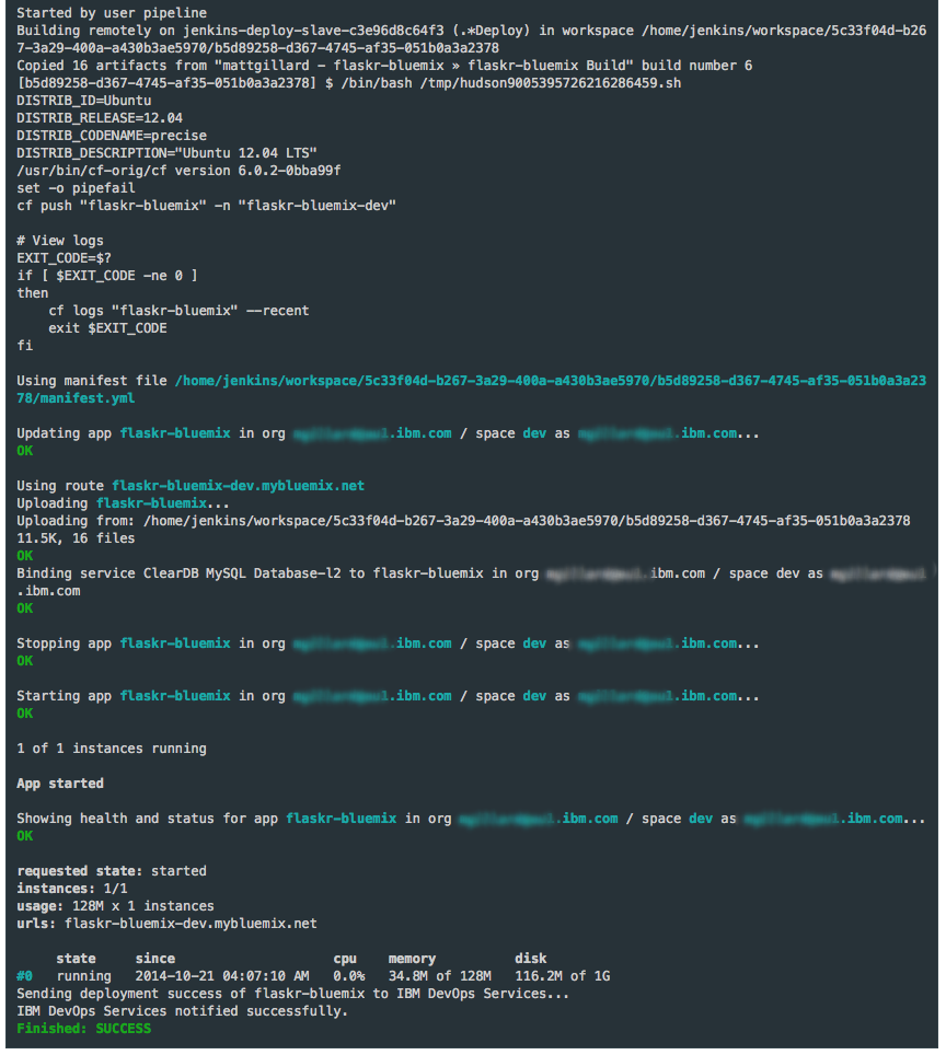 Back in DevOps Services, click on the deployment success URL and it will switch you into your detailed log, where you can see all the steps that were taken to deploy the application.